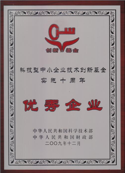 在科技部和財(cái)政部召開的科技型中小企業(yè)技術(shù)創(chuàng)新基金實(shí)施十周年總結(jié)大會(huì)上,我公司被授予“全國科技型中小企業(yè)技術(shù)創(chuàng)新基金工作優(yōu)秀企業(yè)”榮譽(yù)稱號(hào)。