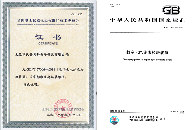 優(yōu)特奧科作為主要起草單位的國家標準《GB/T37006-2018數字化電能表檢驗裝置》于2018年12月28日發(fā)布,2019年7月1日實施。