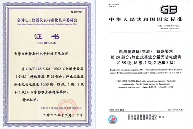 優(yōu)特奧科作為主要起草單位的國家標(biāo)準(zhǔn)《GB/T17215.324-2022電測(cè)量設(shè)備(交流)特殊要求 第24部分:靜止式基波分量無功電能表(0.5S級(jí)、1S級(jí)、1級(jí)、2級(jí)和3級(jí))》于2022年12月30日發(fā)布,2023年7月1日實(shí)施。