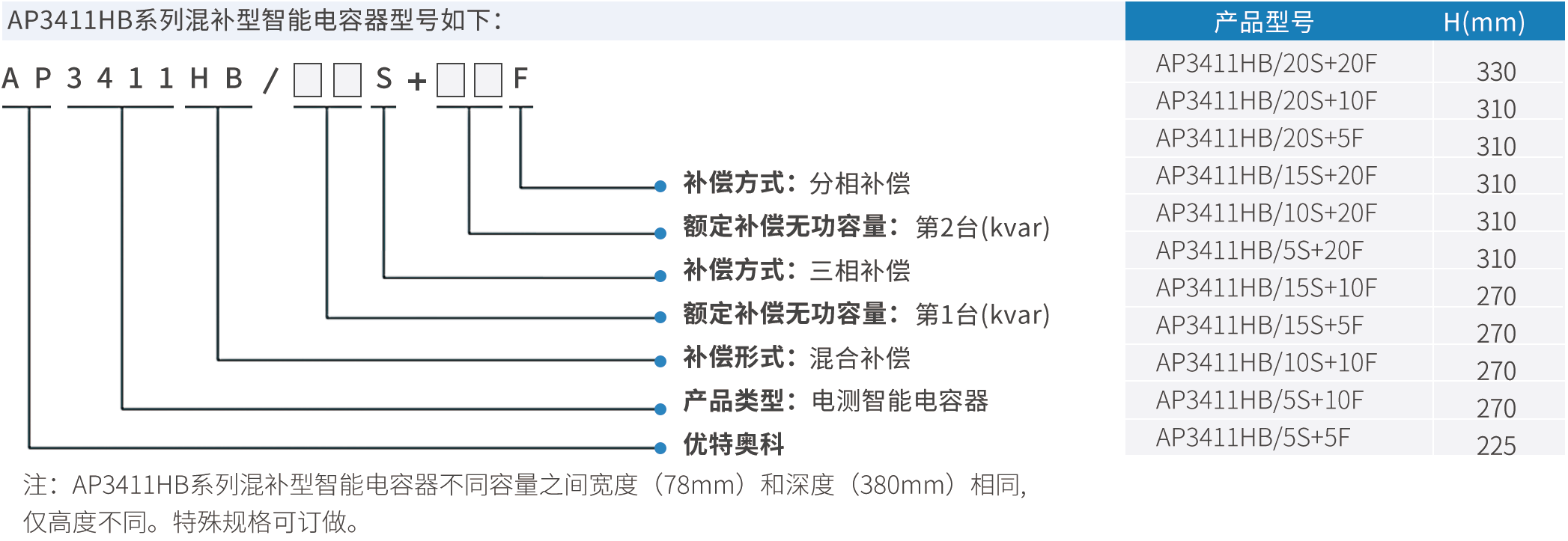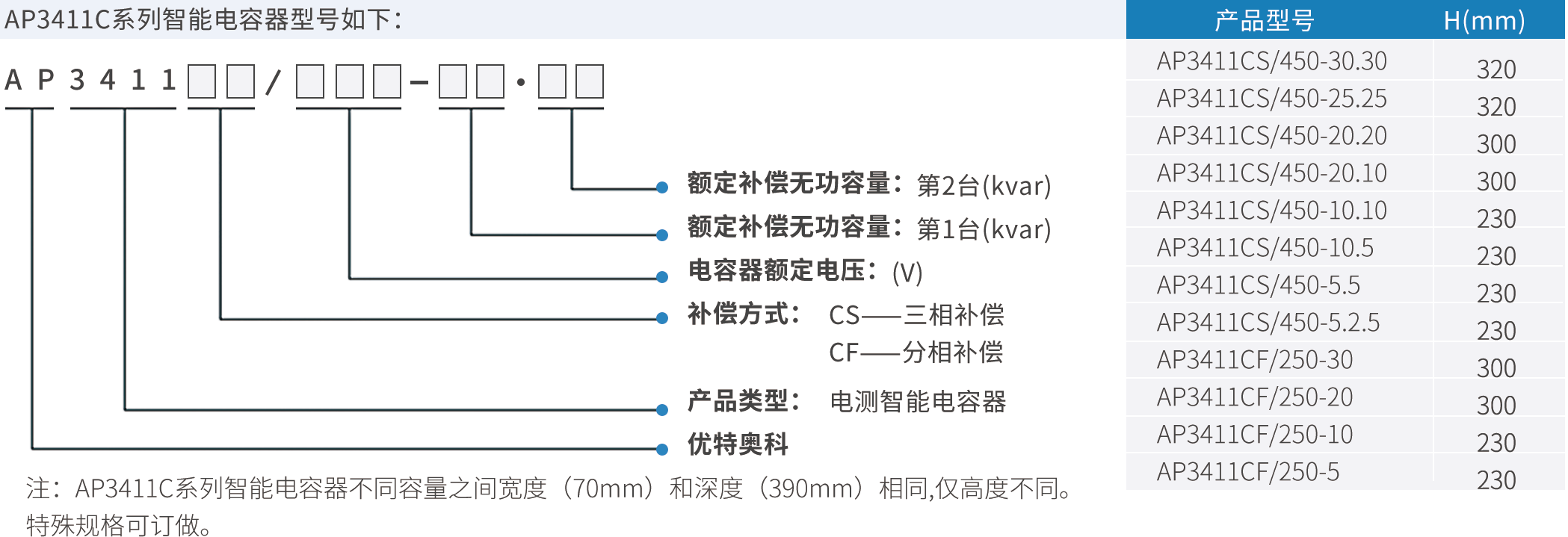 AP3411C系列智能電容器是由智能測控單元、同步零投切開關(guān)、智能保護(hù)單元、組網(wǎng)單元、顯示單元、兩臺(tái)(△型)或一臺(tái)(Y型)低壓自愈式電力電容器組成一個(gè)獨(dú)立完整的智能無功補(bǔ)償系統(tǒng)。產(chǎn)品既可單臺(tái)使用,也可多臺(tái)組網(wǎng)構(gòu)成補(bǔ)償系統(tǒng)使用;既可配套AP系列低壓無功綜合測控儀使用,也可使用二次電流互感器直接構(gòu)成補(bǔ)償系統(tǒng)使用;既可三相補(bǔ)償,也可三相和分相混合補(bǔ)償。AP3411C系列智能電容器應(yīng)用于電網(wǎng)諧波含量較低的低壓電力系統(tǒng)中,可靠運(yùn)行,提高系統(tǒng)功率因數(shù),降低線損,提高電網(wǎng)電能質(zhì)量。 AP3411H系列智能電容器,除具備AP411C系列產(chǎn)品的所有功能外,還可以實(shí)現(xiàn)更大補(bǔ)償容量(40+40)Kvar,更大分?jǐn)嗄芰Γú捎盟軞嗦菲鳎㊣cu≥20KA。 AP3411HB系列混補(bǔ)型智能電容器是由智能測控單元、零投切開關(guān)、智能保護(hù)單元、一臺(tái)(△型)和一臺(tái)(Y型)低壓自愈式電力電容器組成一個(gè)獨(dú)立完整的智能補(bǔ)償單元,替代由智能無功控制器、熔絲(或微斷)、晶閘管復(fù)合開關(guān)(或接觸器)、熱繼電器、低壓電力電容器多種分散器件組裝而成的自動(dòng)無功補(bǔ)償裝置。